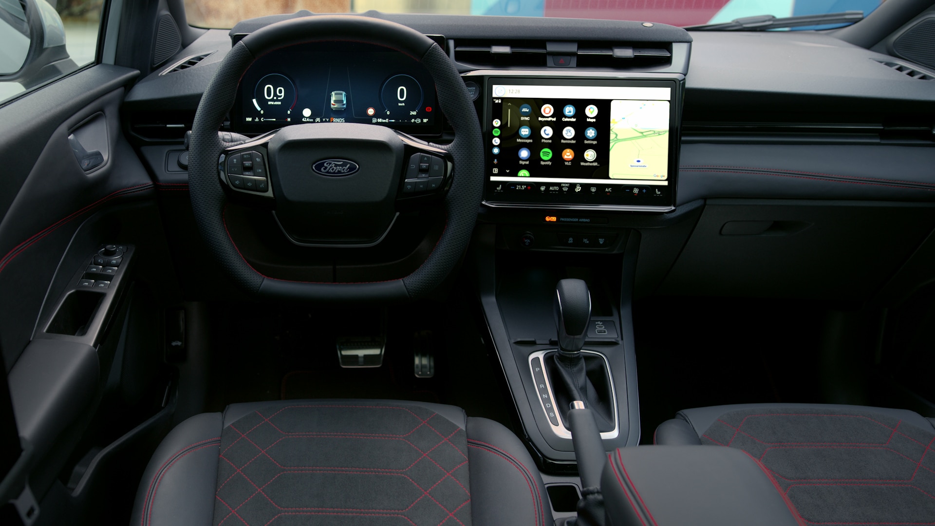 Interiér nového Ford Puma sa vyznačuje športovo orientovaným kokpitom, kde je prístrojový panel a dotykový displej mierne natočený k vodičovi pre jednoduchší prístup. Dominantou je digitálny prístrojový cluster s uhlopriečkou približne 12,8 palca spolu s centrálnym obrazovkou infotainmentu veľkosti cca 12 palcov, ktoré poskytujú moderné zobrazovanie a konektivitu. Materiály v kabíne pôsobia kvalitnejšie — napríklad mäkčené povrchy, nastaviteľná loketná opierka, voliteľná panoramatická strecha pre viac svetla a voľby ako prémiový zvukový systém B&O pre lepší zážitok. Hoci ide o kompaktný crossover, priestor pre posádku je dobrý – v batožinovom priestore je dostupný podpodlahový úložný priestor „MegaBox”, dopĺňajúci už tak veľký základný objem kufra. Celkovo pôsobí interiér Pumy ako prepojenie funkčnosti, technológie a komfortu — ideálne pre moderné mestské aj výletné využitie.